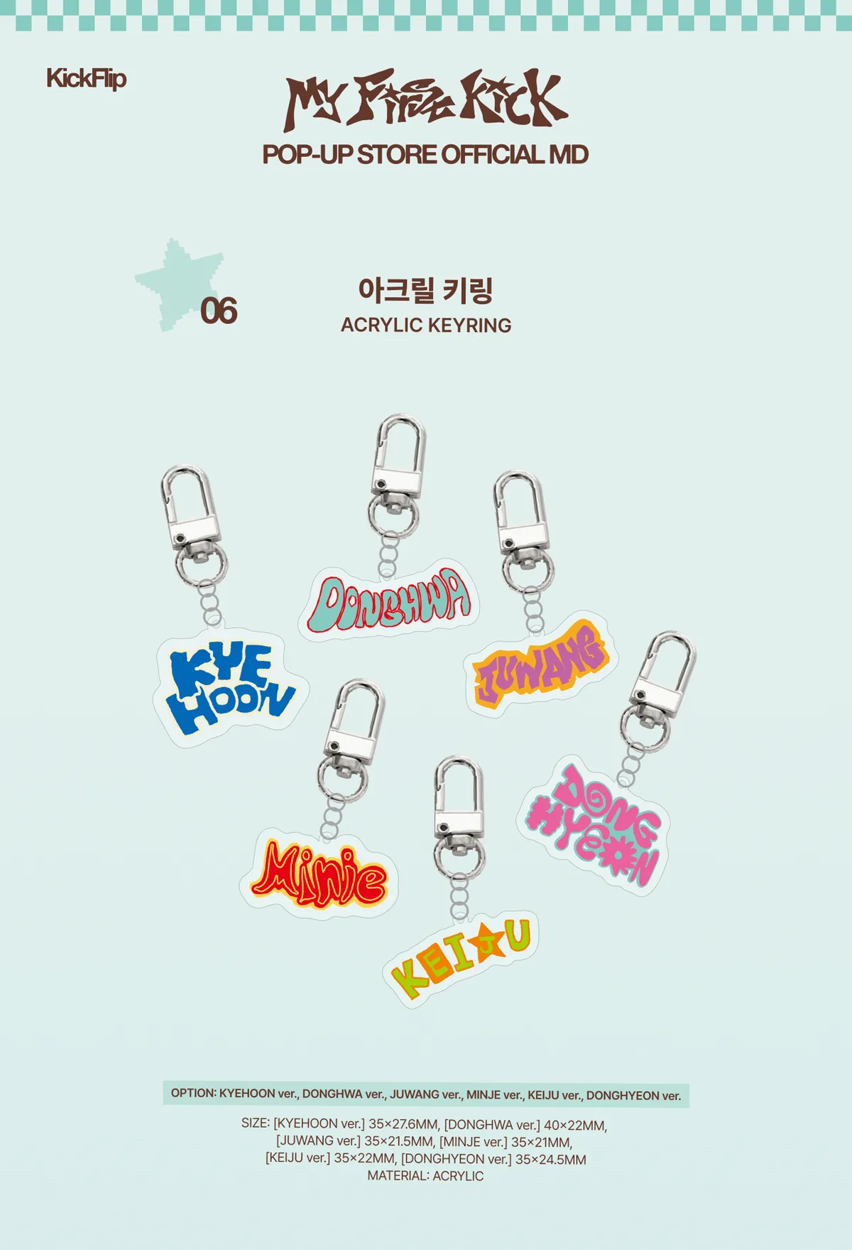 4/19(日) 23:59結單🛹 KickFlip [My First Kick] POP-UP STORE !! 官方預計4/27後陸續出貨🚚 !! 🎁滿額贈: 單筆消費滿₩50,000,即贈 小卡1張 (共 6 款 / 隨機附贈 / 可累贈)壓克力鑰匙圈 ₩10,000