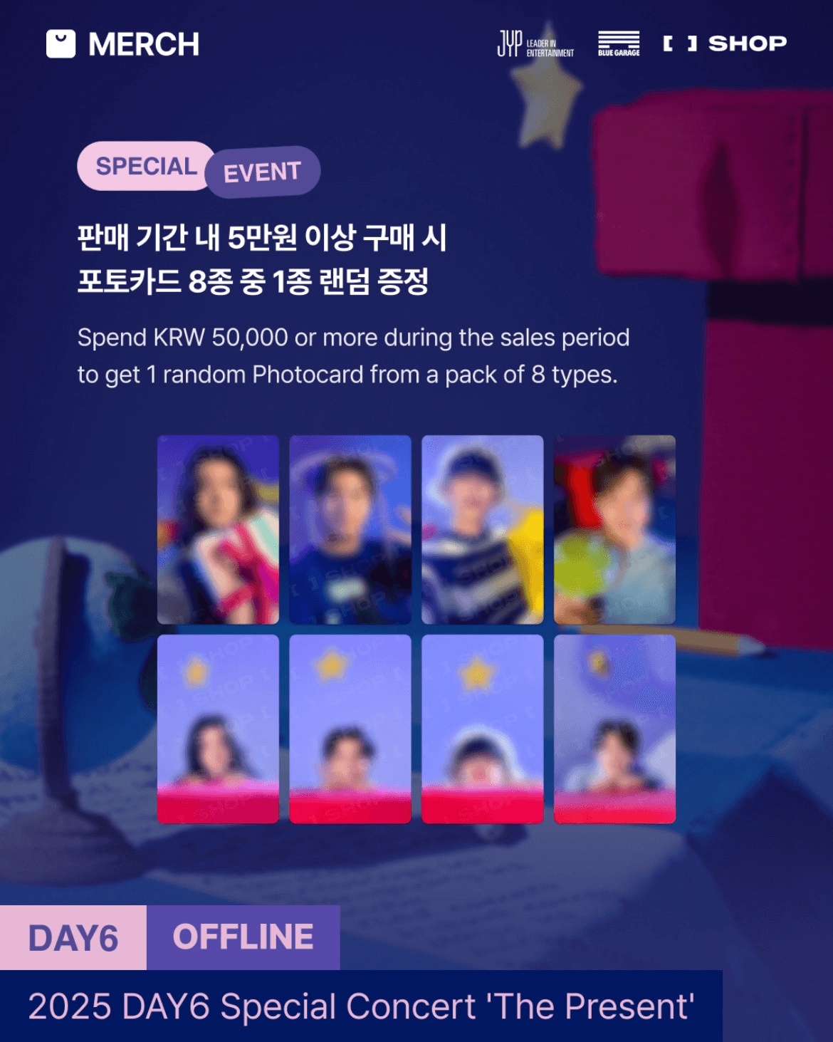 12/28(日) 20:00結單🍀2025 DAY6 Special Concert "The Present" ⚠️若訂單內含巨娃,將以「郵寄」方式出貨.ᐟ.ᐟ 🎁滿額贈: 單筆消費滿₩50,000,即贈 線上(下)小卡1張 (共 8 款 / 隨機附贈 / 可累贈)🐻🦊🐰🐶
